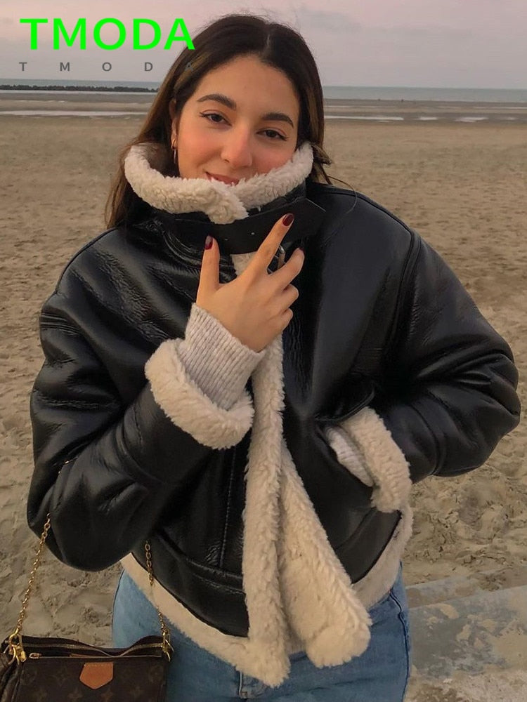 Chic Women’s Faux Leather Shearling Jacket - Harajuku Style