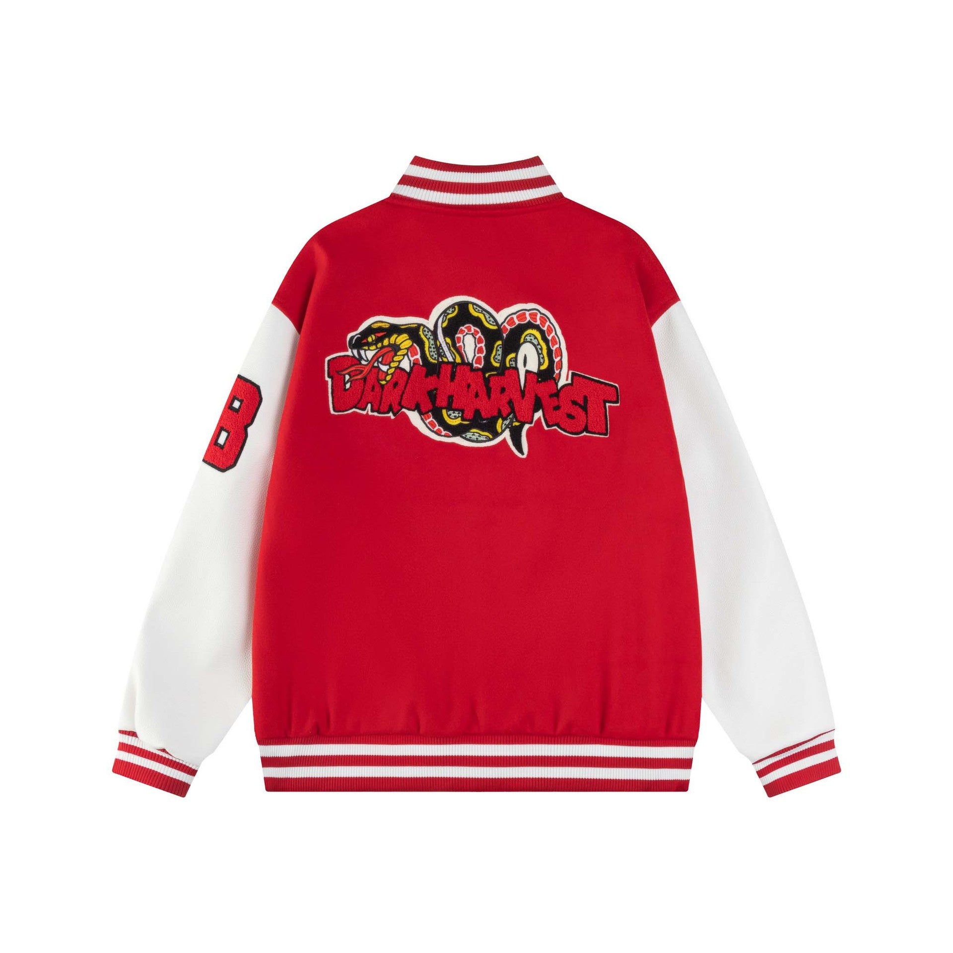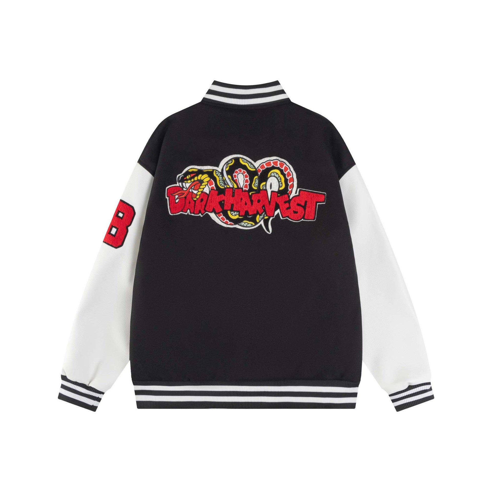 Step into the world of Harajuku fashion with our playful Collage Color Leather Snake Letter Embroidery Bomber Jacket! This unisex coat is designed for those who dare to be bold and express their unique style.
