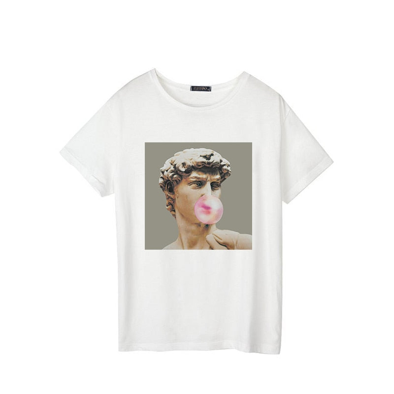 Unleash your playful side with our David Michelangelo Bubble Gum Printed Harajuku T-Shirt, a unique blend of art and street style. Perfect for those who love to stand out, this tee captures the essence of Harajuku fashion while showcasing a fun twist on a classic masterpiece.