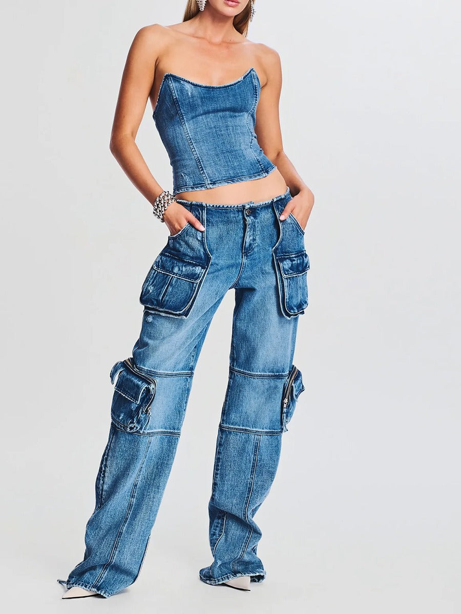 Harajuku Style Mid Waist Buckle Multi-Pocket Denim Pants