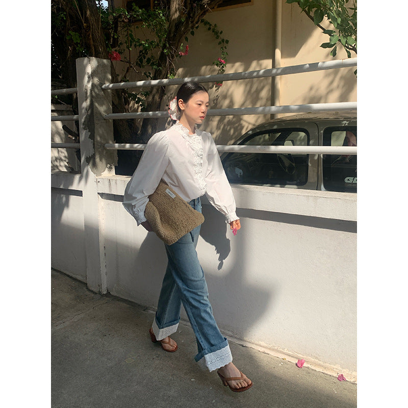 Lace Curled Edge Wide Leg Straight Leg Jeans for Women