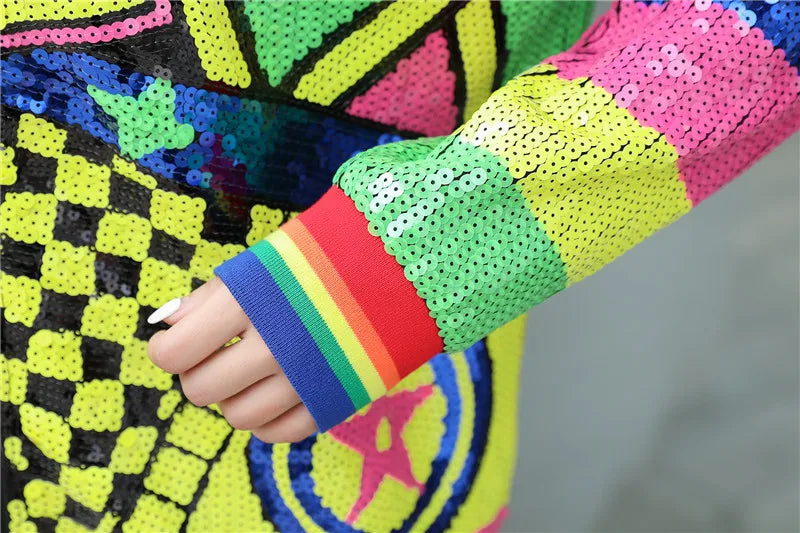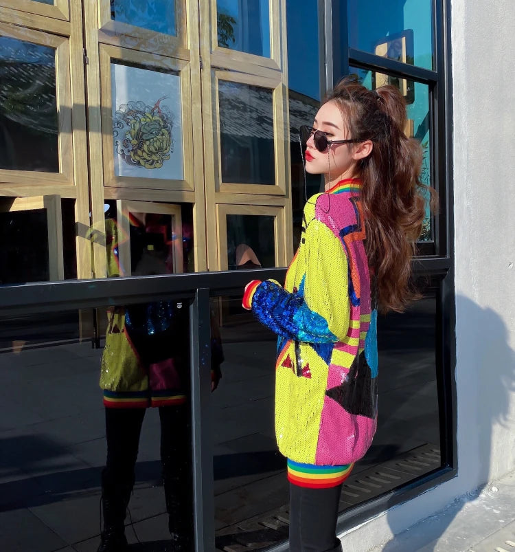 Step out in style with our Playful Geometric Print Long Sleeve Jacket, designed for the bold and fashionable. This jacket captures the essence of Harajuku fashion with its unique geometric patterns and eye-catching sequins, making it an essential piece for your wardrobe.