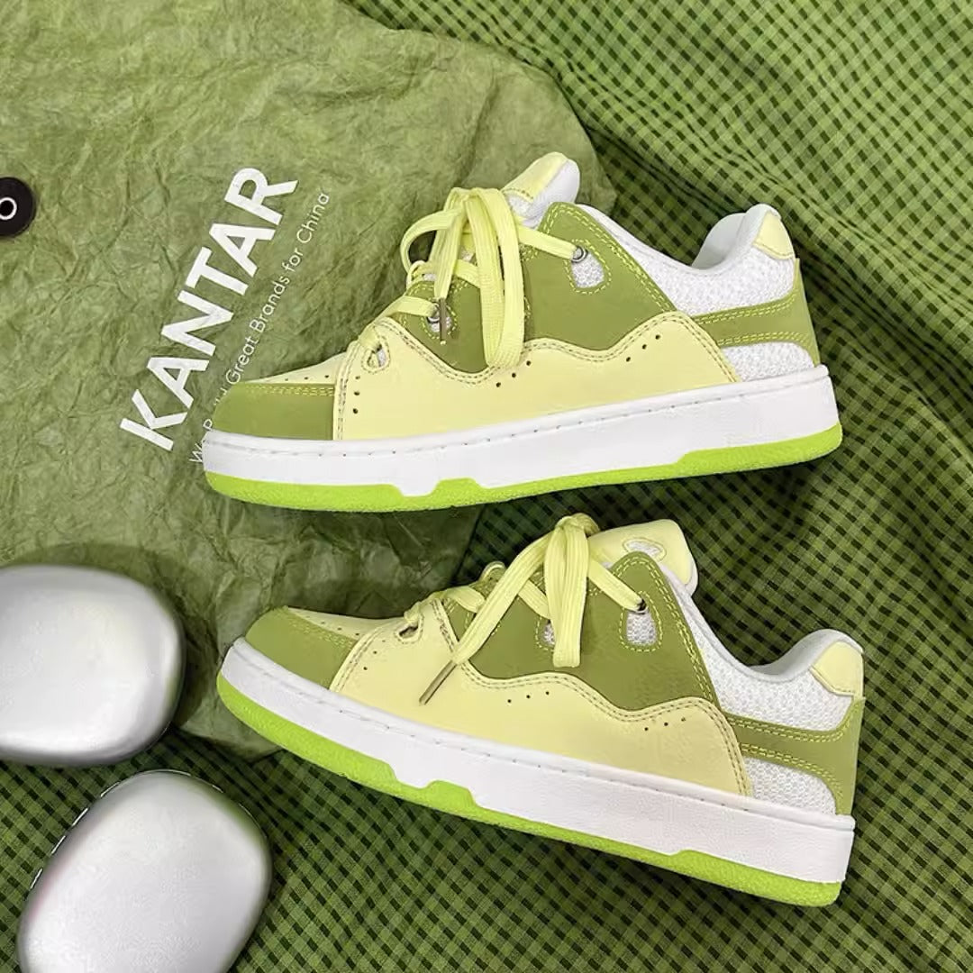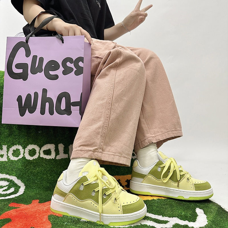 Step into the world of playful fashion with our Retro Colorful Bread Shoes, designed for men and women who love to express their unique style. These comfortable skateboard shoes are a bold fusion of vibrant yellow, green, and white, perfect for those who embrace Harajuku fashion and want to stand out. Crafted with care, these shoes offer both style and functionality, making them a must-have in your wardrobe.