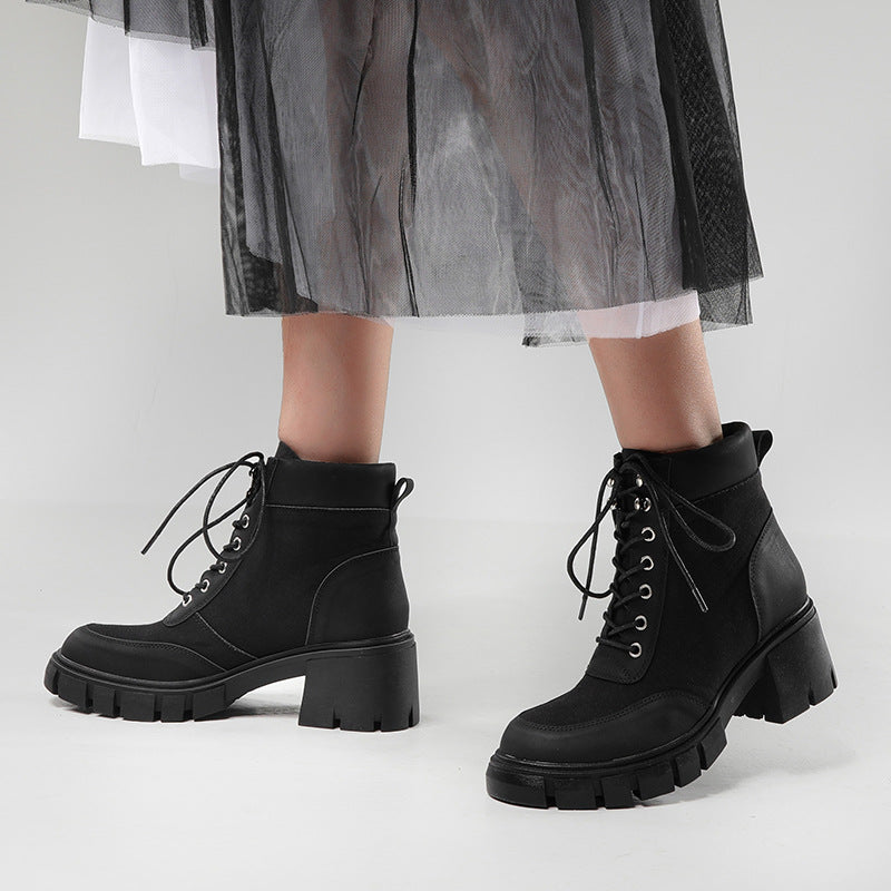 Thick Soled Short Boots for Women with Straps - Round Toe Boots