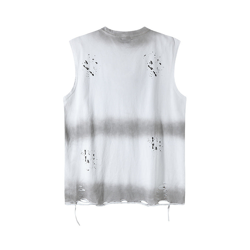 Tie-Dye Gradient Letter Sleeveless T-Shirt with Distressed Holes