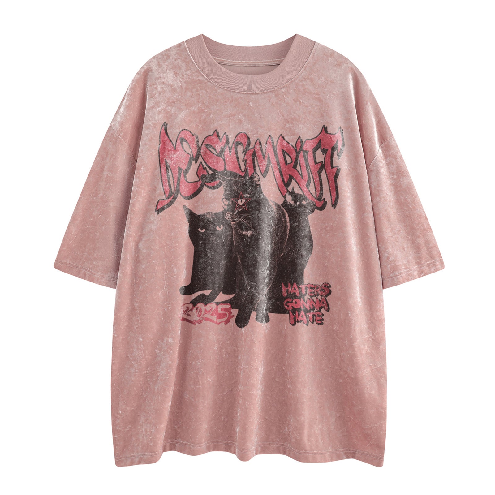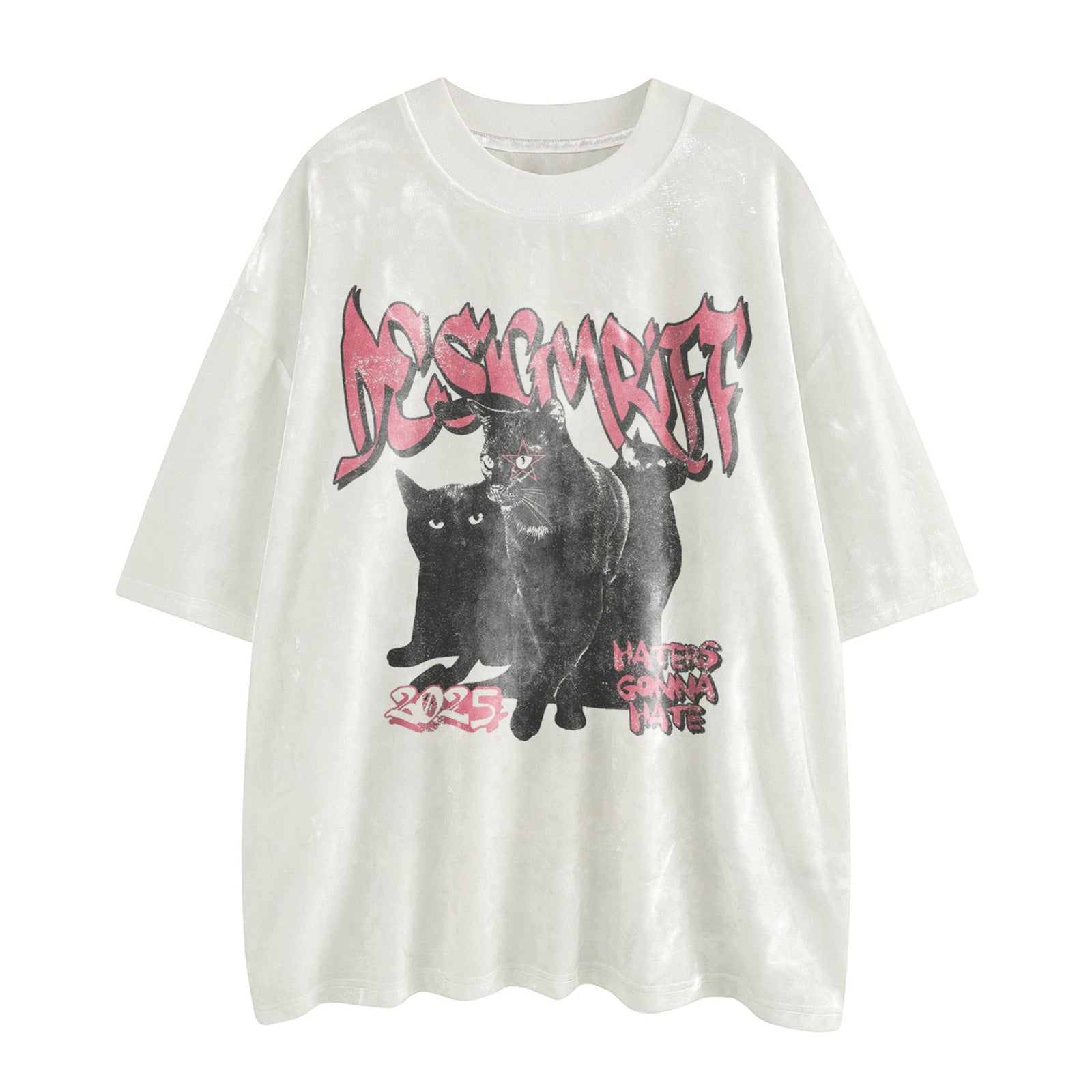 Trendy Cat Print Velvet T-Shirt - Unisex Oversized Style