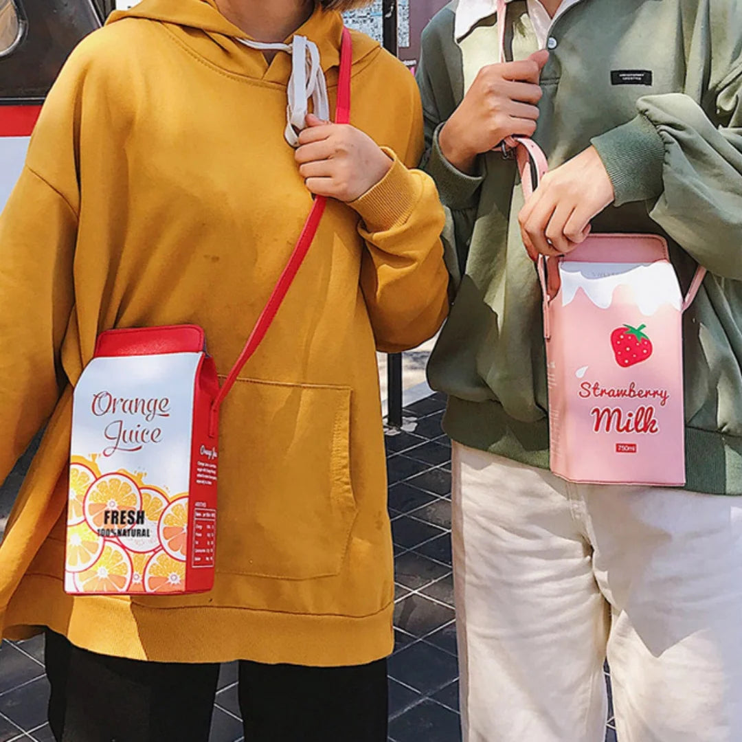 A bold, Harajuku-inspired handbag that blends whimsical milk carton charm with a compact, square silhouette. This shoulder bag is designed for easy crossbody wear, making it a playful yet practical statement piece for everyday outfits or bold street looks.