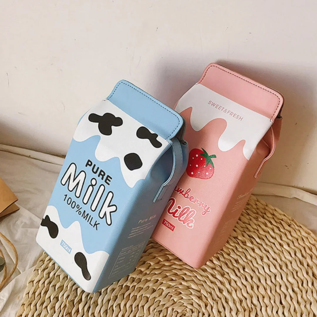 - Milk carton shaped bag with a small square body for a cute, collectible vibe